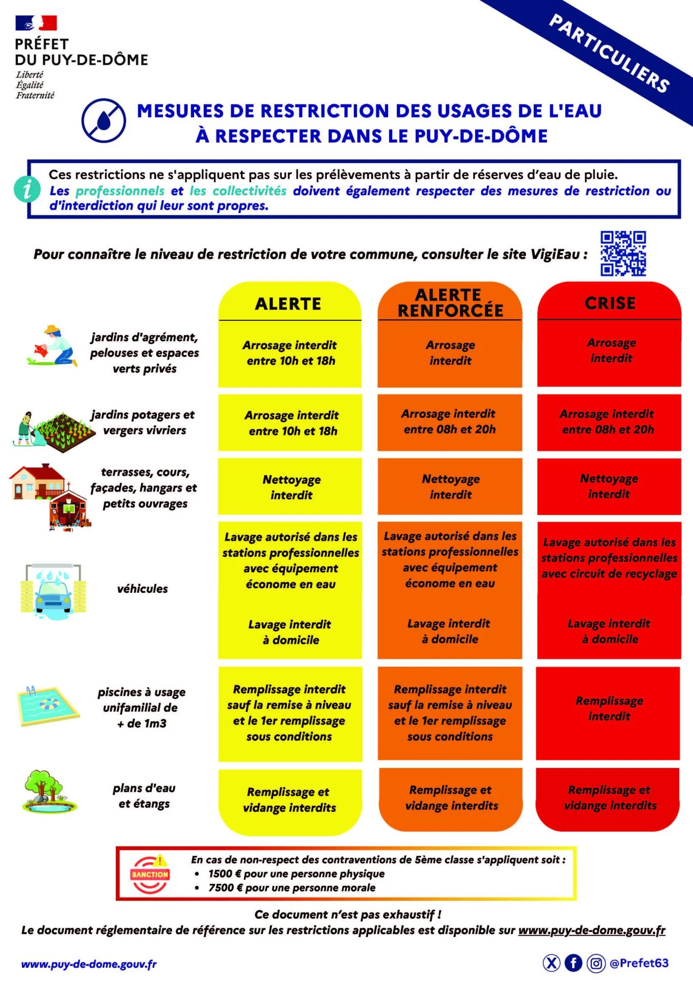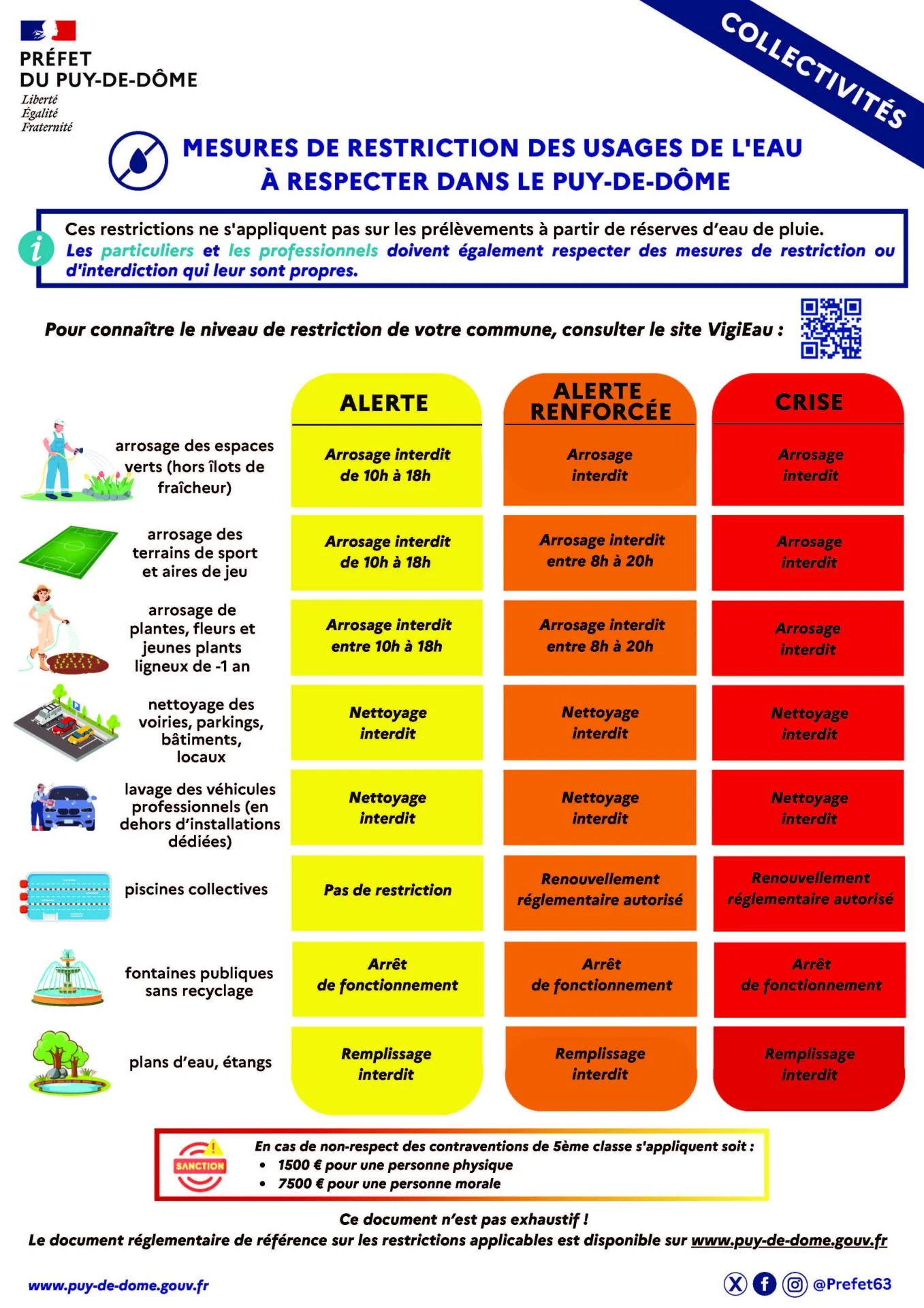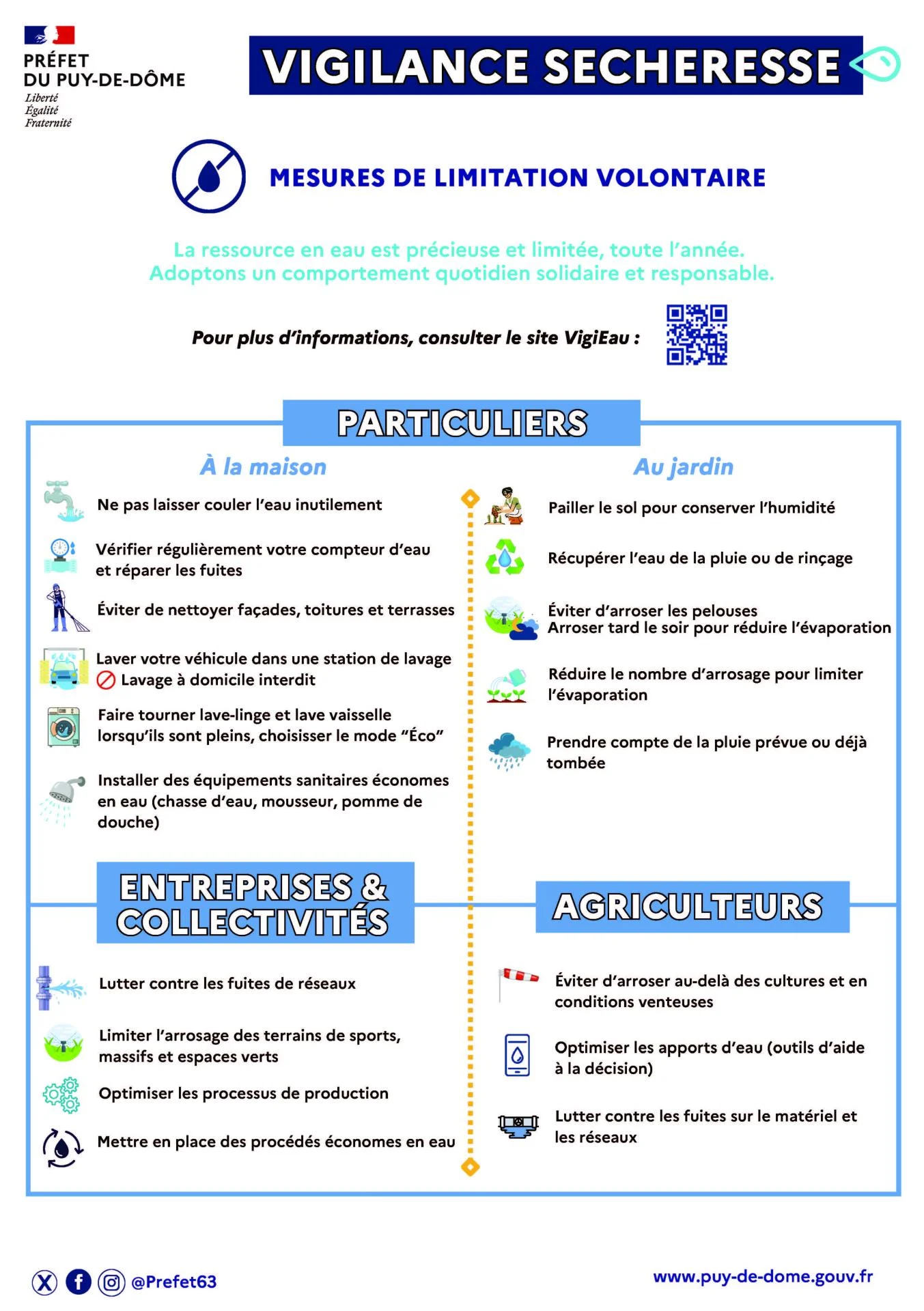 Le suivi quotidien de la situation hydrologique montre une dégradation de l'état de la ressource en eau, liée à l'absence de précipitations et aux températures relativement élevées. Le Préfet du Puy-de-Dôme consulte régulièrement les membres du comité départemental de l'eau (CDE) pour étudier la situation et proposer de nouvelles mesures de restriction des usages de l'eau.